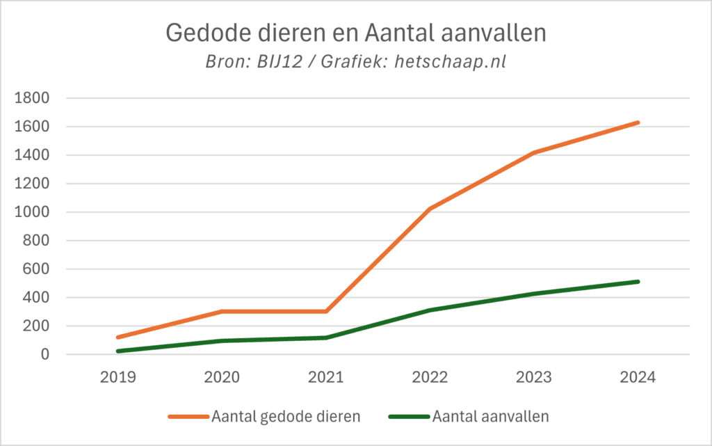 Het aantal wolvenaanvallen stijgt, er zijn ook steeds meer wolven. Het gemiddeld aantal gedode dieren per aanval blijft wel al een paar jaar rond de 3,3 gedode dieren per aanval liggen. Opvallend is dat vooral in Gelderland een aantal grote aanvallen plaatsvond met aantallen als 12, 22 en zelfs 39 gedode dieren.