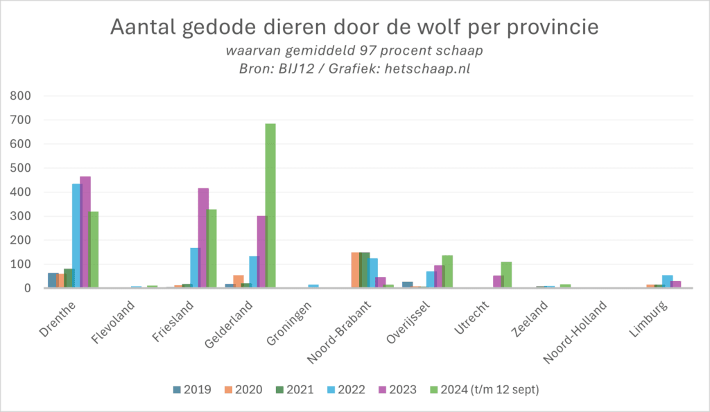 In Gelderland werden de meeste dieren gedood, gevolgd door Friesland en daarna Drenthe. In Limburg is dit jaar nog geen dier gedood door een wolf en in Brabant daalde het aantal dieren juist. De wolf die daar was gevestigd is al een tijd verdwenen.