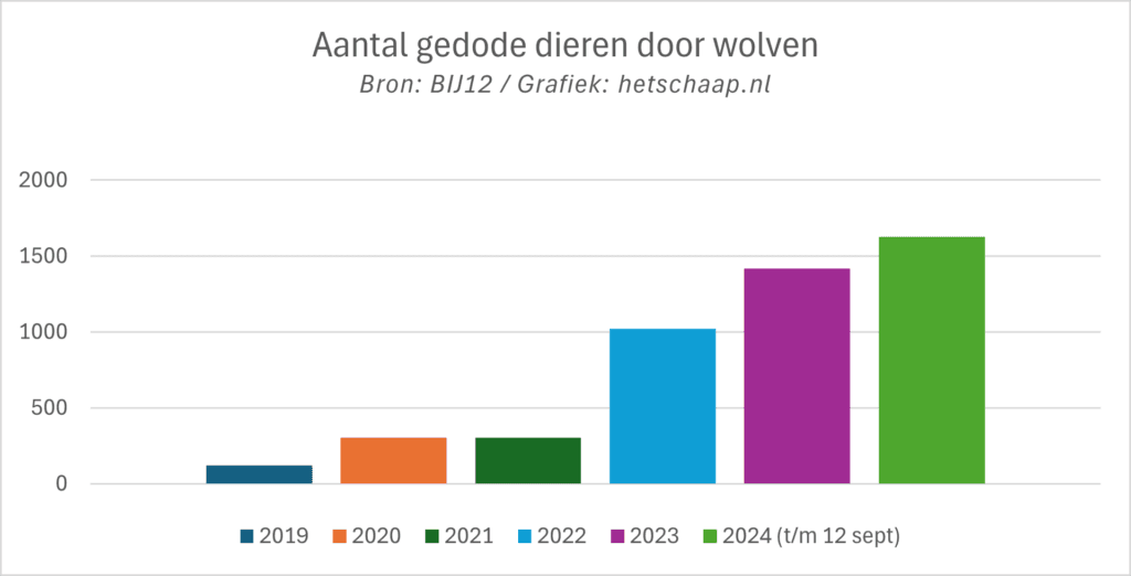 Wolven hebben dit jaar al veel vaker schapen en andere dieren aangevallen dan in heel 2023. In de eerste negen maanden van 2024 zijn 491 aanvallen op dieren geregistreerd, tegenover 399 in heel vorig jaar. Dat blijkt uit cijfers van BIJ12.