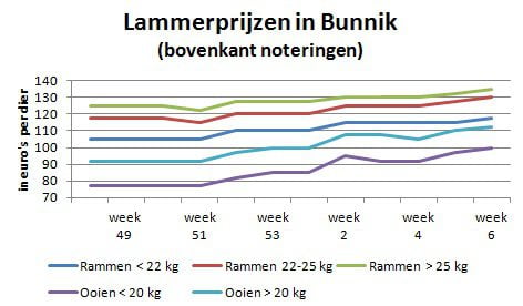 De lammerprijzen stegen vorige week met €2,50 in Bunnik. Sinds half december brengen ooien en rammen gestaag meer op. De marktprijzen liggen nu €12,50 tot €23 hoger.