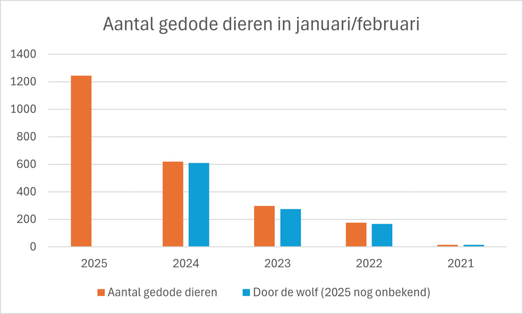 Het aantal dieren dat is gedood in de eerste twee maanden van het jaar is in 2025 verdubbeld ten opzichte van een jaar eerder, dat blijkt uit de cijfers van BIJ12. Dit jaar werden er al 1243 dieren gedood tijdens een (vermoedelijke wolven-)aanval. Het overgrote deel van de gedode dieren is schapen.