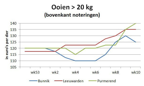 Slachtschapen eerste kwaliteit: €130 tot €140 (+€5). Tweede kwaliteit: €55 tot €85 (+€5).