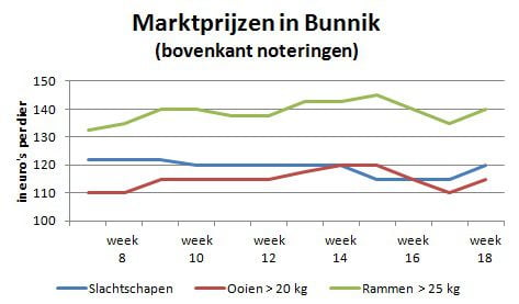 Slachtschapen eerste kwaliteit: €105 tot €120 (+€5). Tweede kwaliteit: €20 tot €45 (+€5).