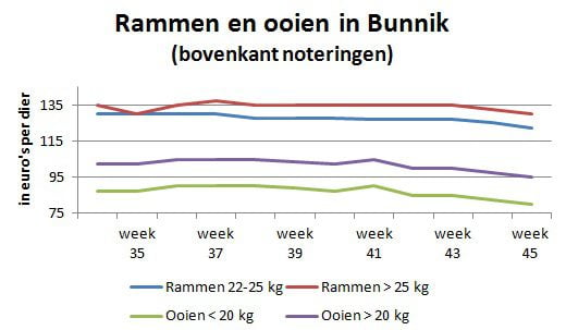 Ooien tot 20 kg: €70 tot €80 (-€2,50). Ooien boven 20 kg: €85 tot €95 (-€2,50).
