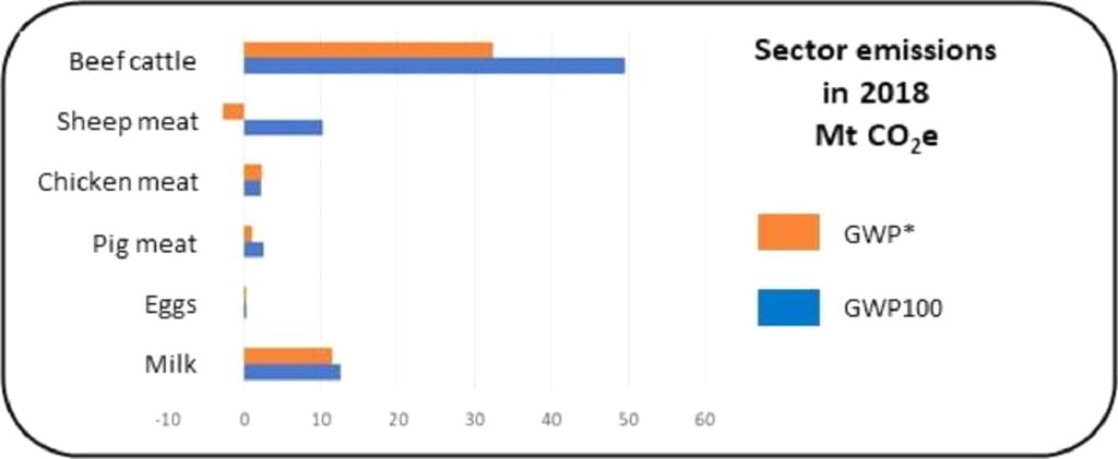 Brad Ridoutt toonde bij zijn verhaal ook de onderstaande grafiek. GWP (Global Warming Potential) is een maatstaf voor de opwarmingspotentie van broeikasgassen. Het vergelijkt de bijdrage van het broeikaseffect met die van kooldioxide. CO₂ is het referentiepunt omdat het het meest voorkomende broeikasgas is en het het langst in de atmosfeer blijft.