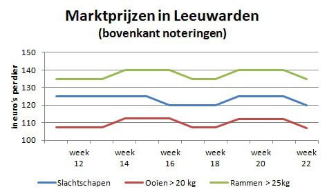 Slachtschapen eerste kwaliteit: €110 tot €125 (+€5). Tweede kwaliteit: €25 tot €50 (+€5).