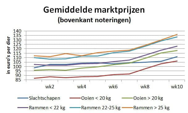 Slachtschapen eerste kwaliteit: €60 tot €115 (+€10). Tweede kwaliteit: €10 tot €60 (+€10).