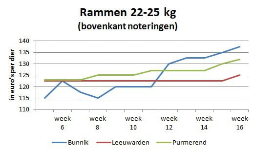 Het prijsherstel bij de rammen tot 25 kg zette zich half maart in. De prijsstijging is het sterkst in Bunnik, maar ook de andere veemarkten koersen omhoog.
