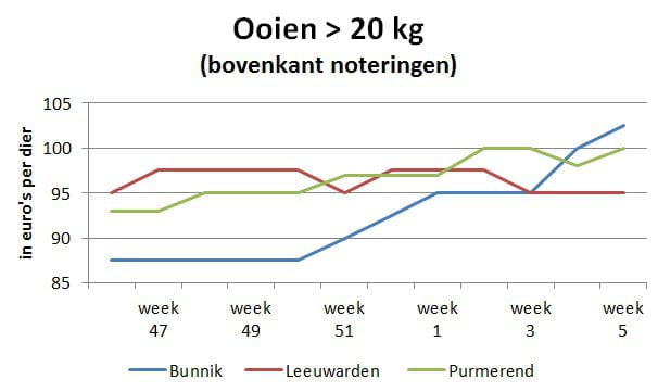 De marktnotering van ooien boven 20 kg ging vorige week omhoog in Bunnik en Purmerend. Op de Utrechter veemarkt kwam de notering voor het eerst in maanden boven de grens van €100.