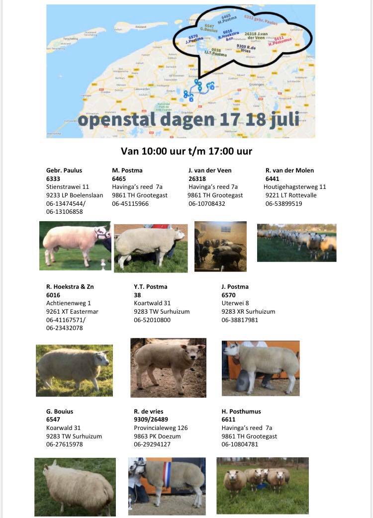Deelnemende fokkers zijn Marcus Postma, Jannes van der Veen, Riemer van der Molen, Romke en Filippus Hoekstra, Jelmer Postma, Wieger, Edgar en Arno Paulus, Yme Postma, Gerrit Bouis, Rinnert de Vries en Hendrik Posthumus. De meeste fokken witte Texelaars, een fokt Blauwe Texelaars en een beide rassen.