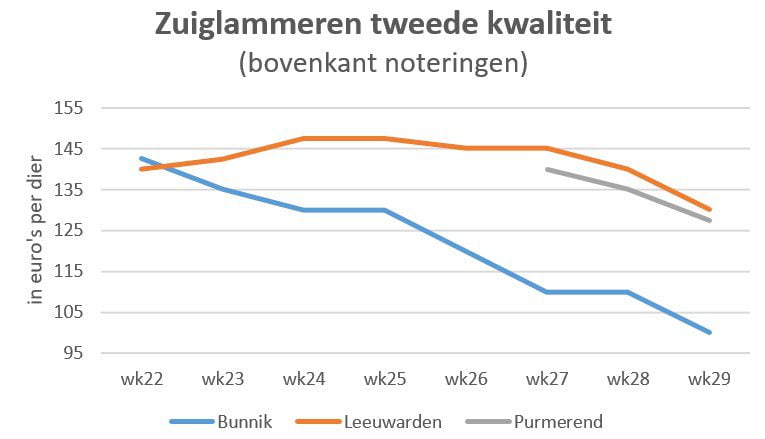 De prijzen van zuiglammeren gingen vorige week opnieuw naar beneden, op elke veemarkt. Zowel eerste als tweede kwaliteit bracht €5 tot €10 minder op.