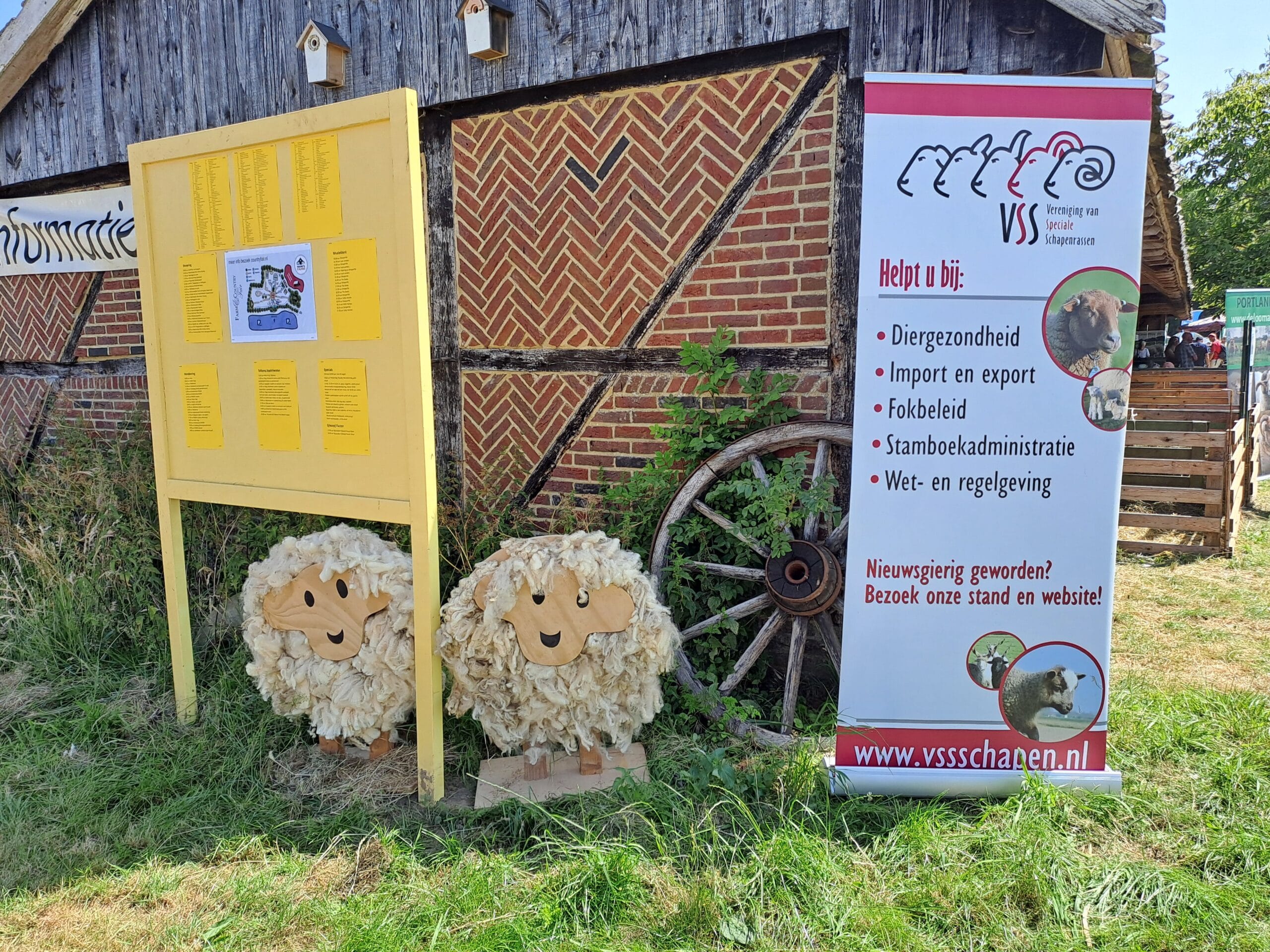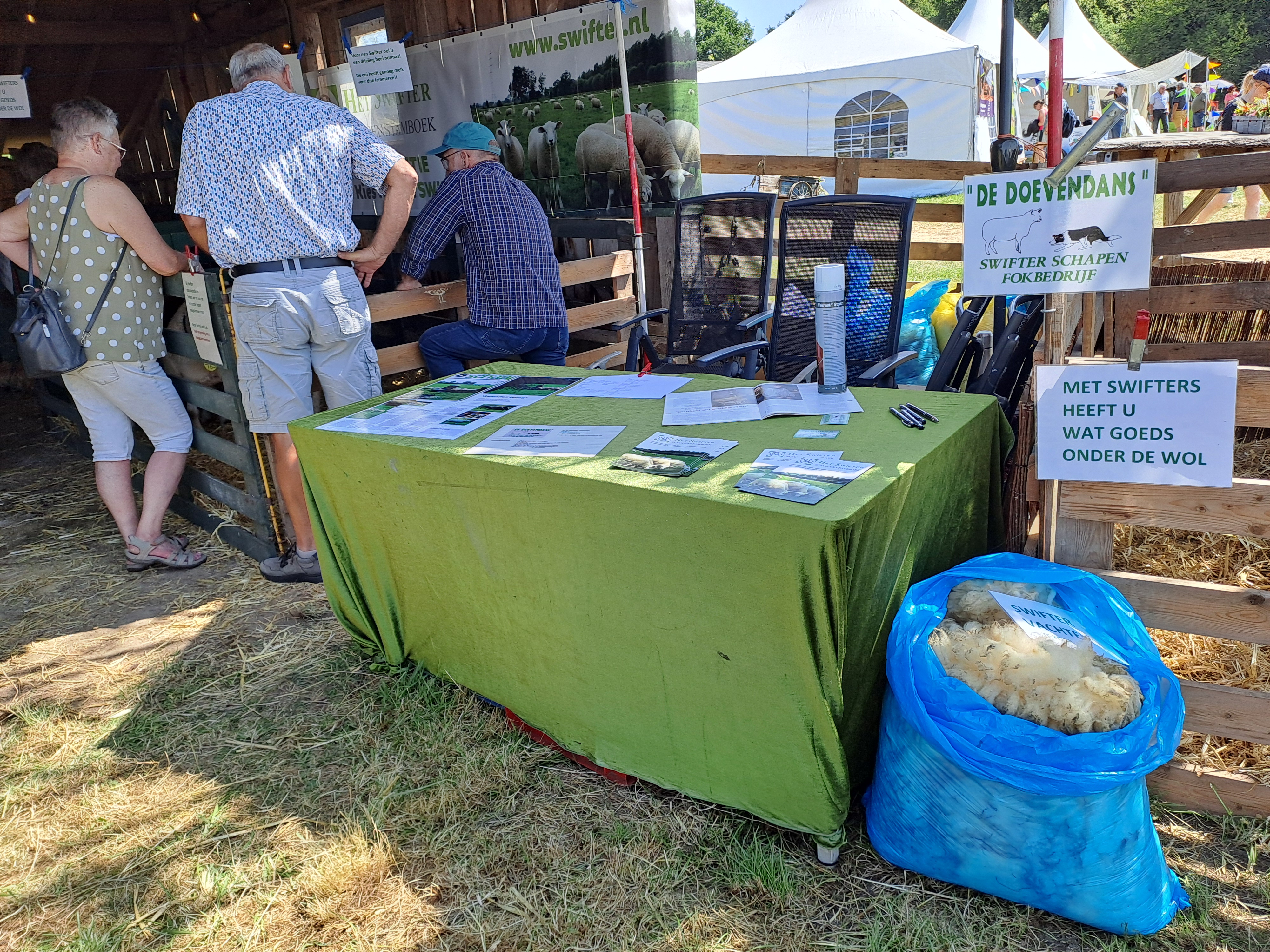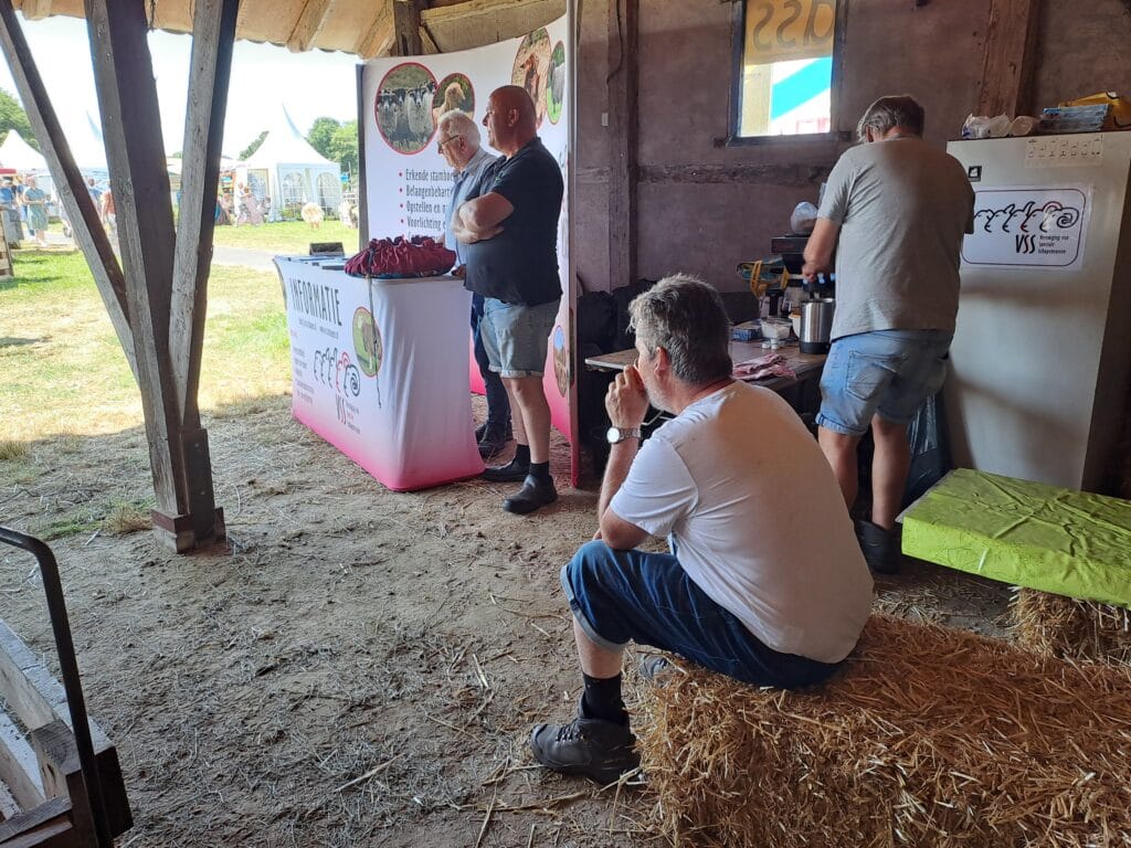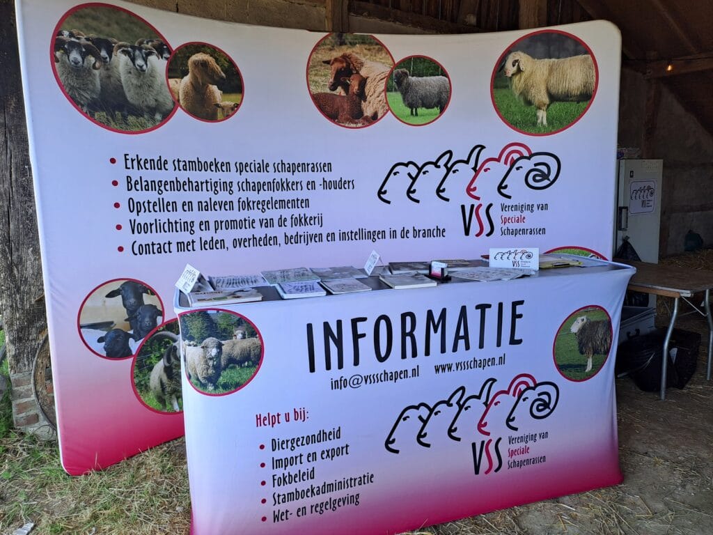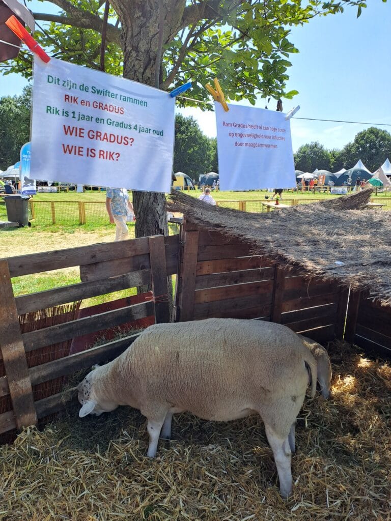 Teunissen heeft een prijsvraagje opgehangen: welke ram is 1 jaar en welke 4 jaar? “Het lijkt heel simpel, maar door zo’n vraag kom je sneller met mensen in gesprek,” zegt hij. “Bezoekers vinden dat soort dingen gewoon heel leuk.” Hij heeft een tafel met informatie en er staat een grote banner met de Swifter. “Ik hoor ook bij een wat groter stamboek met zo’n 300 leden, dan is er ook wat meer geld voor promotiemateriaal.”