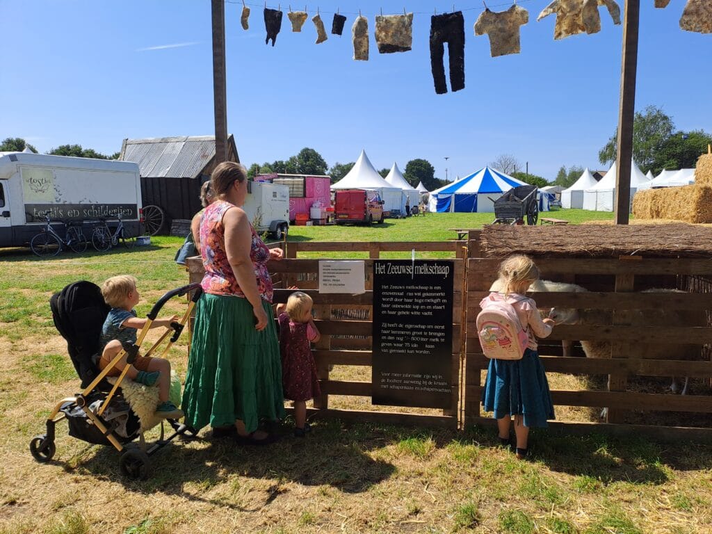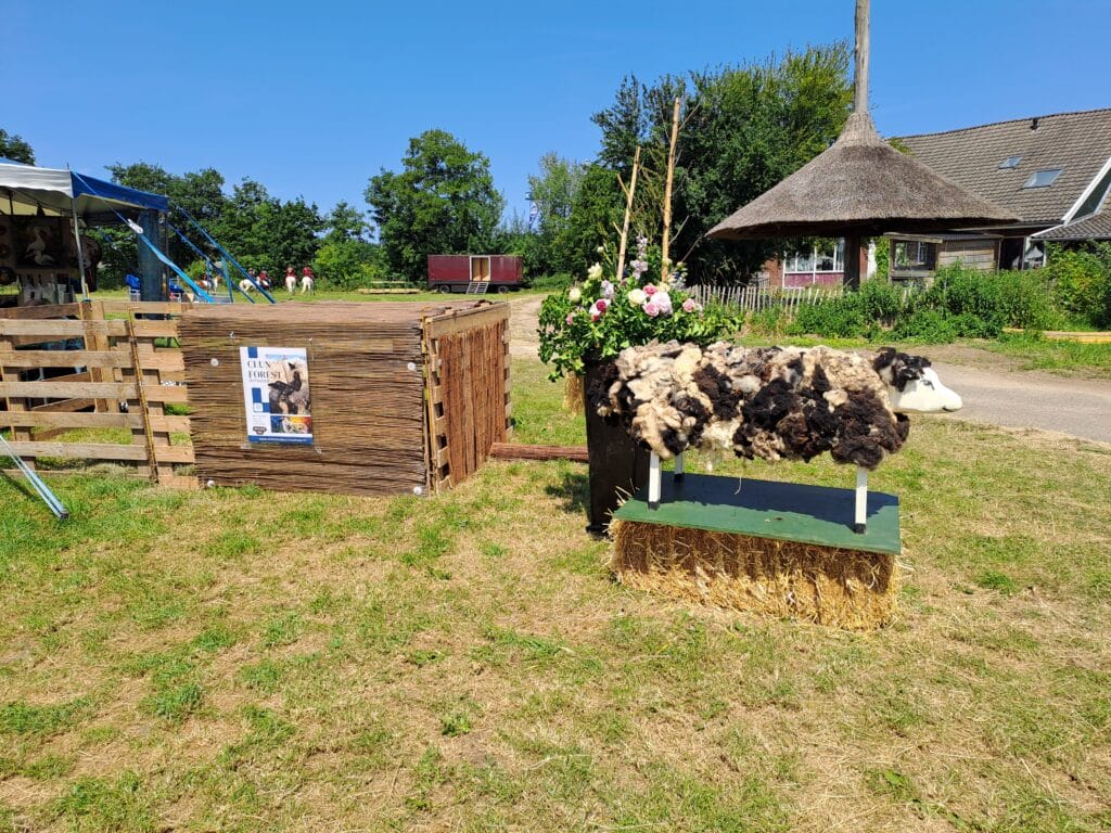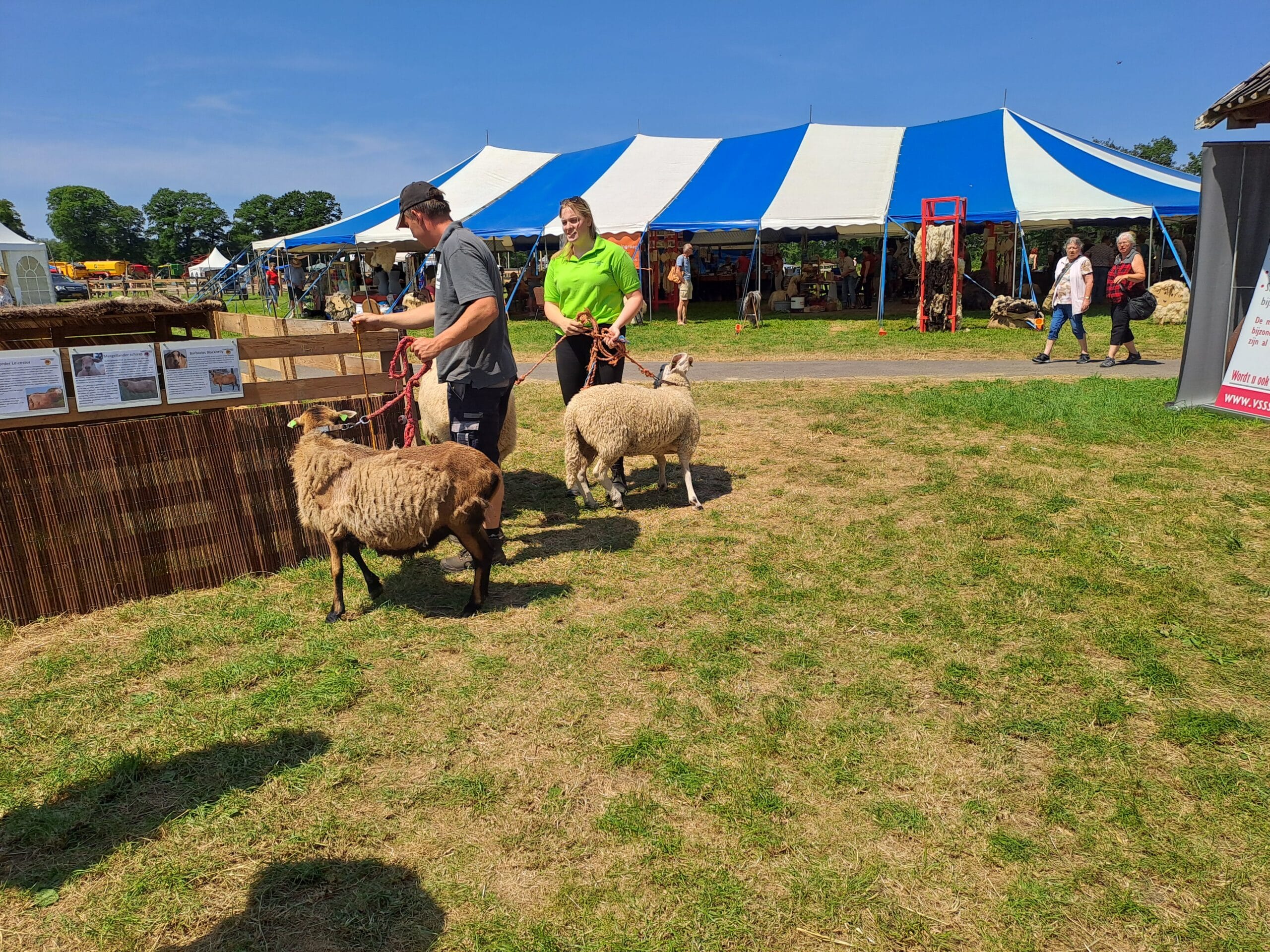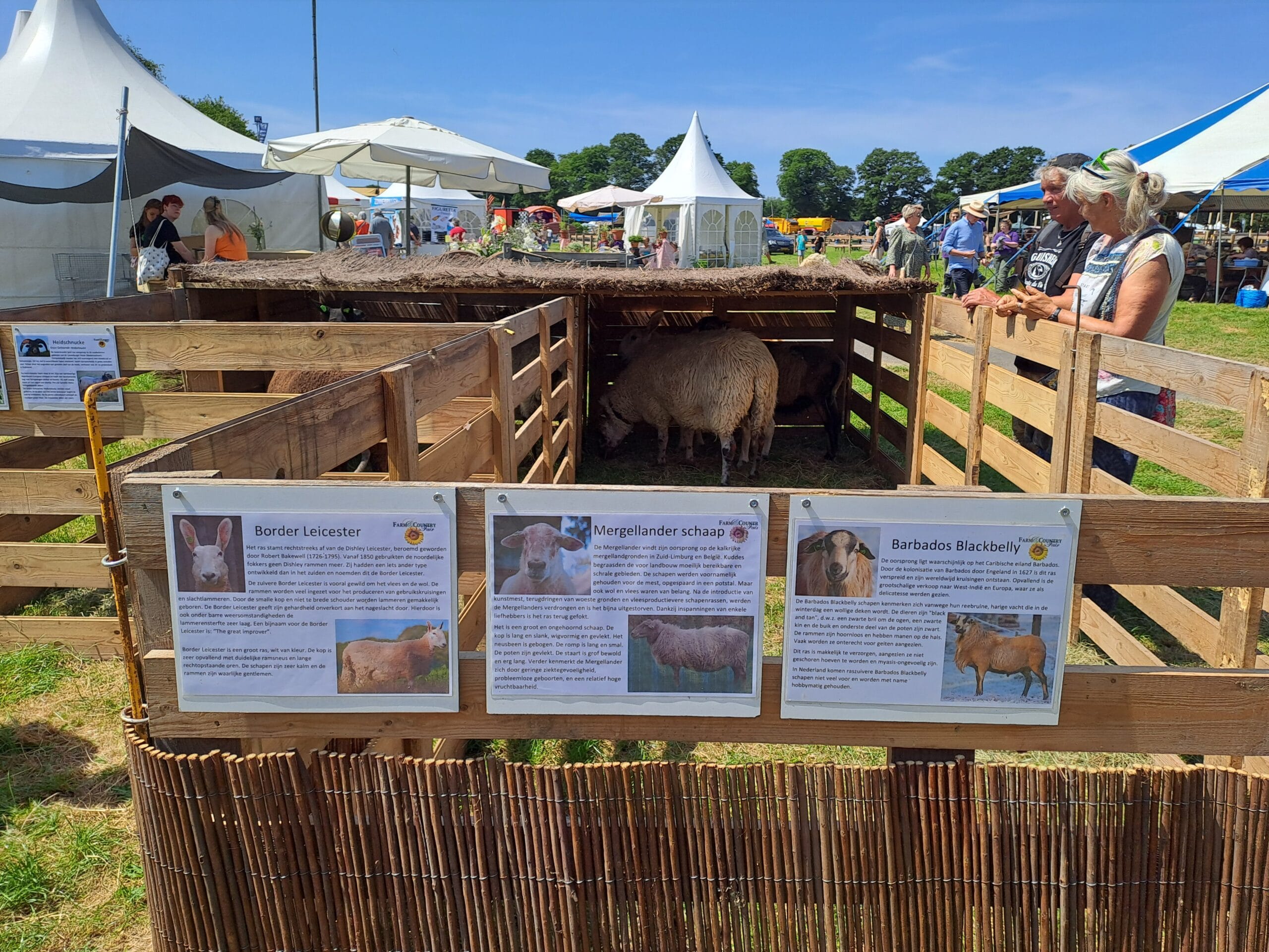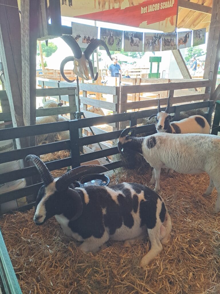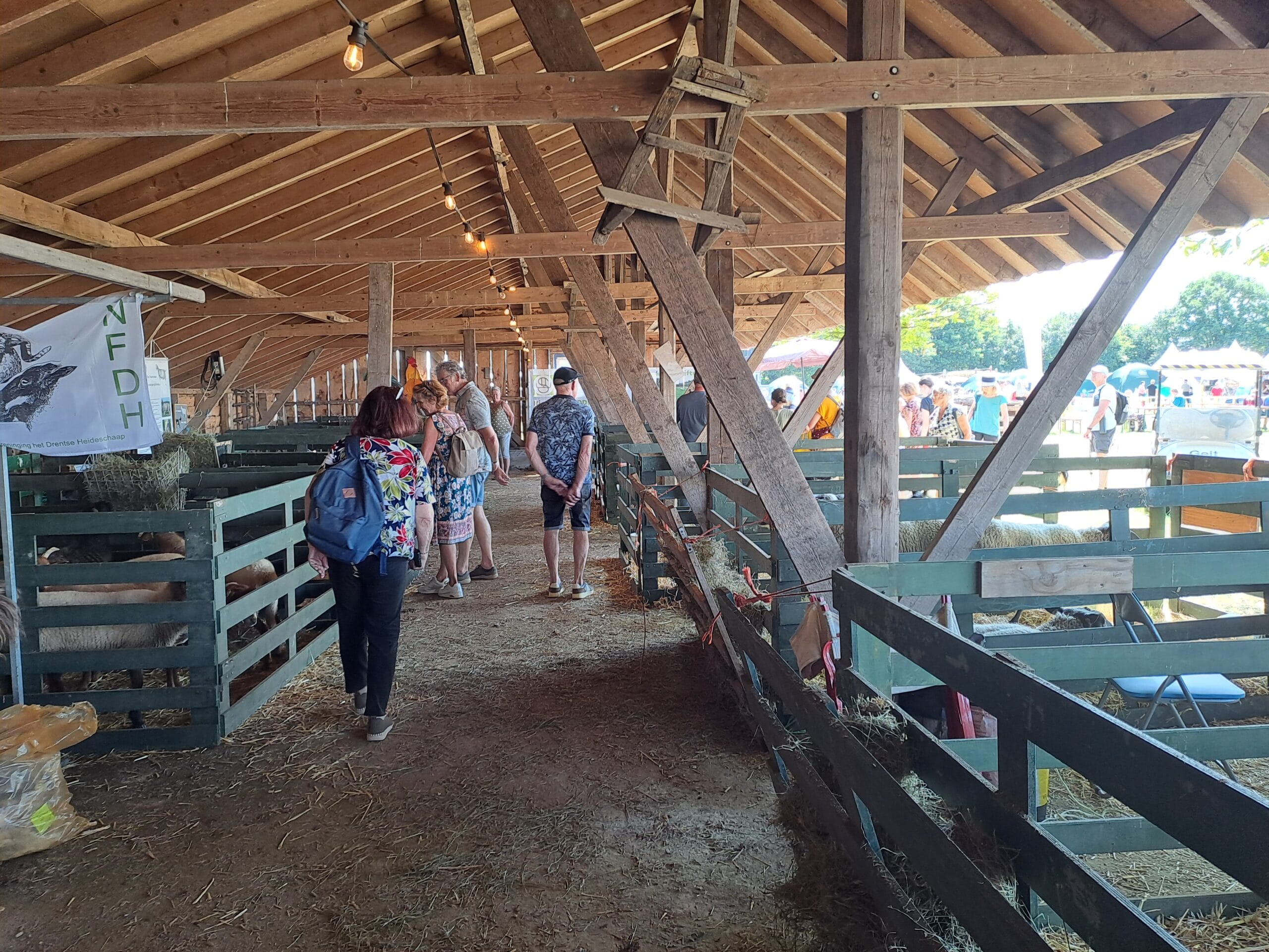 Het was al vroeg druk op de eerste dag van de Farm & Country Fair in Aalten. Bezoekers wilden blijkbaar nog rond voordat de zon het terrein al te heet maakte. Het Schapendorp had gelukkig niets te klagen in hun schaduwrijke schuur met bomen ervoor en een fijne bries er doorheen.