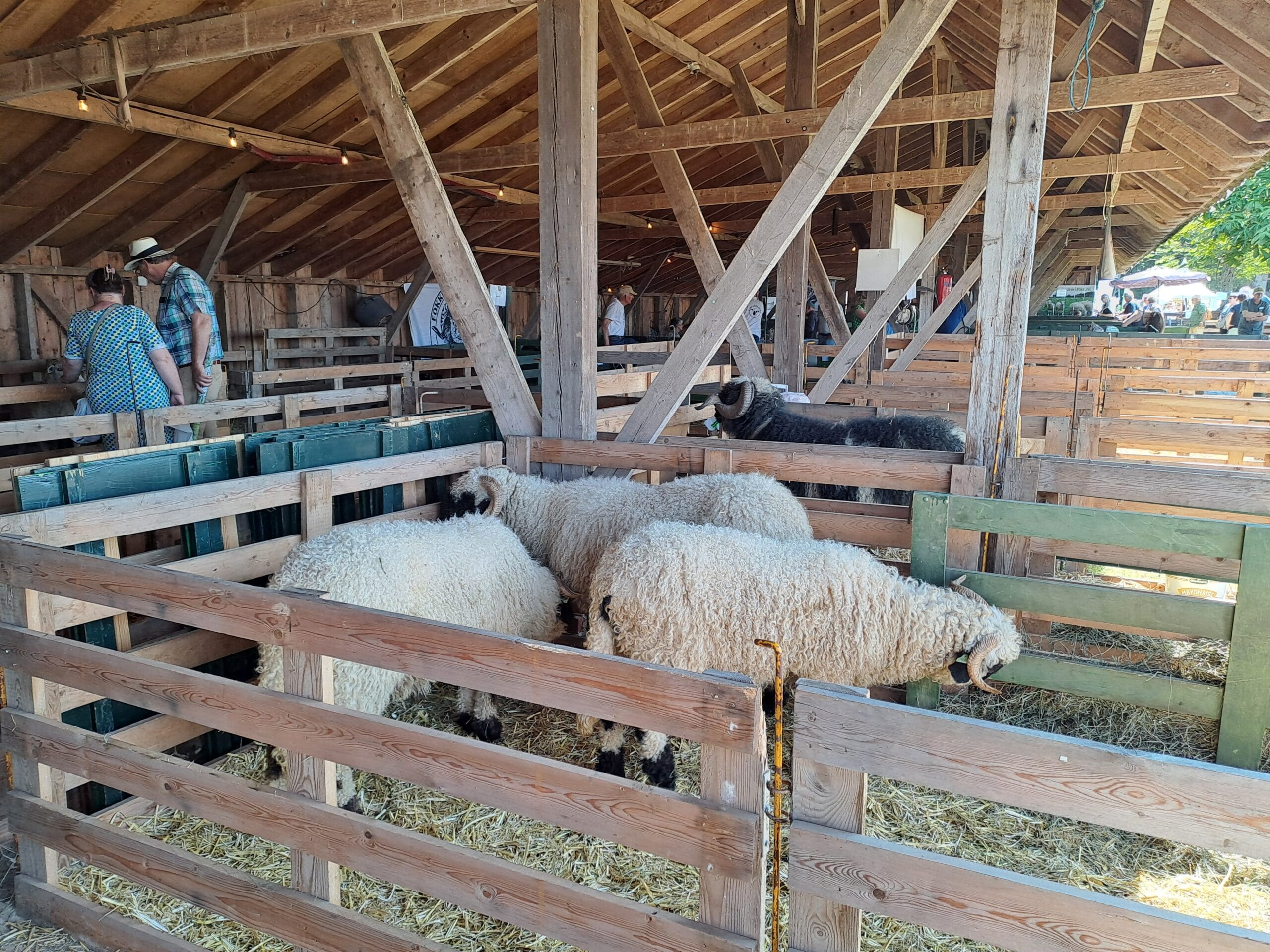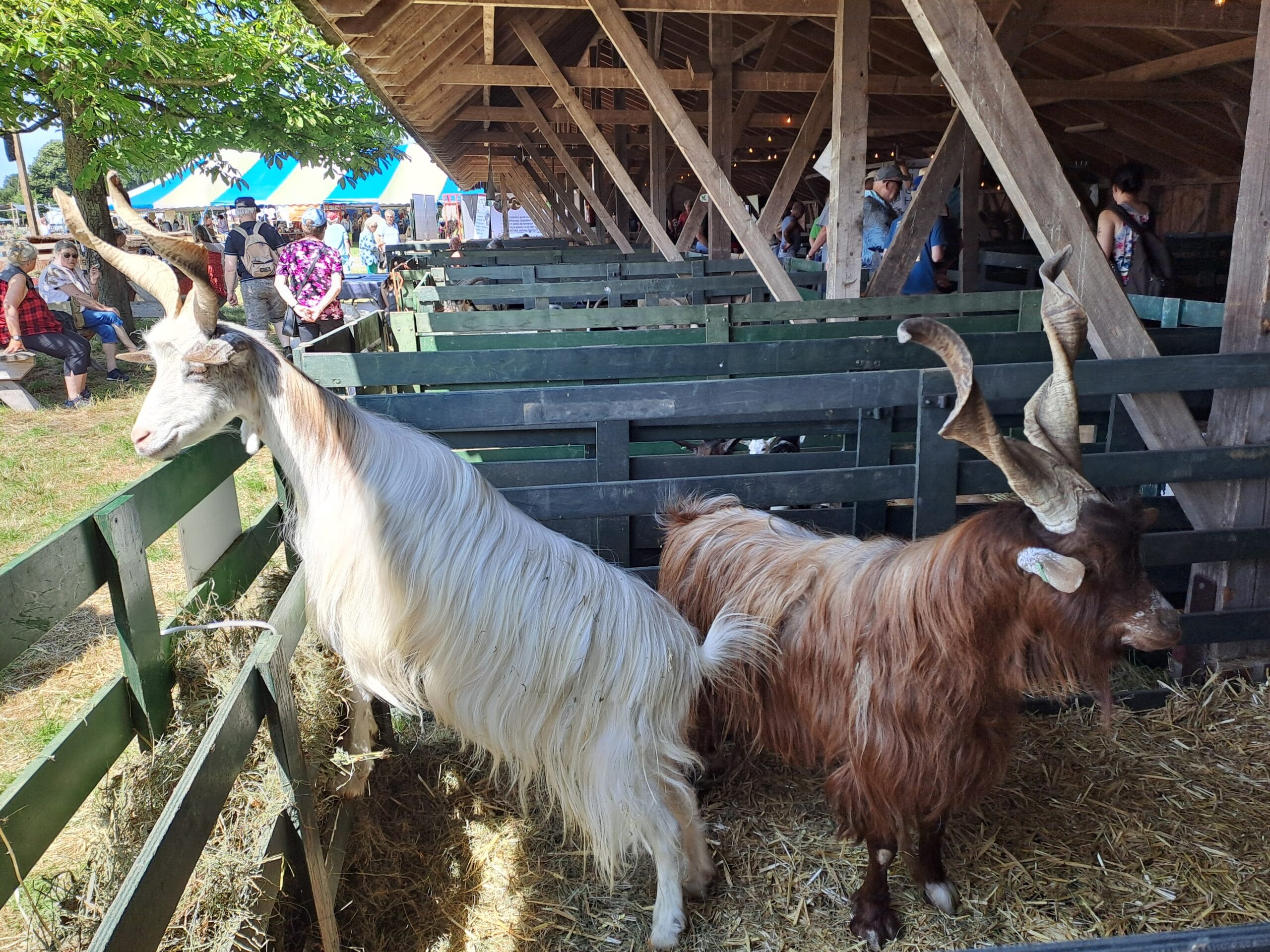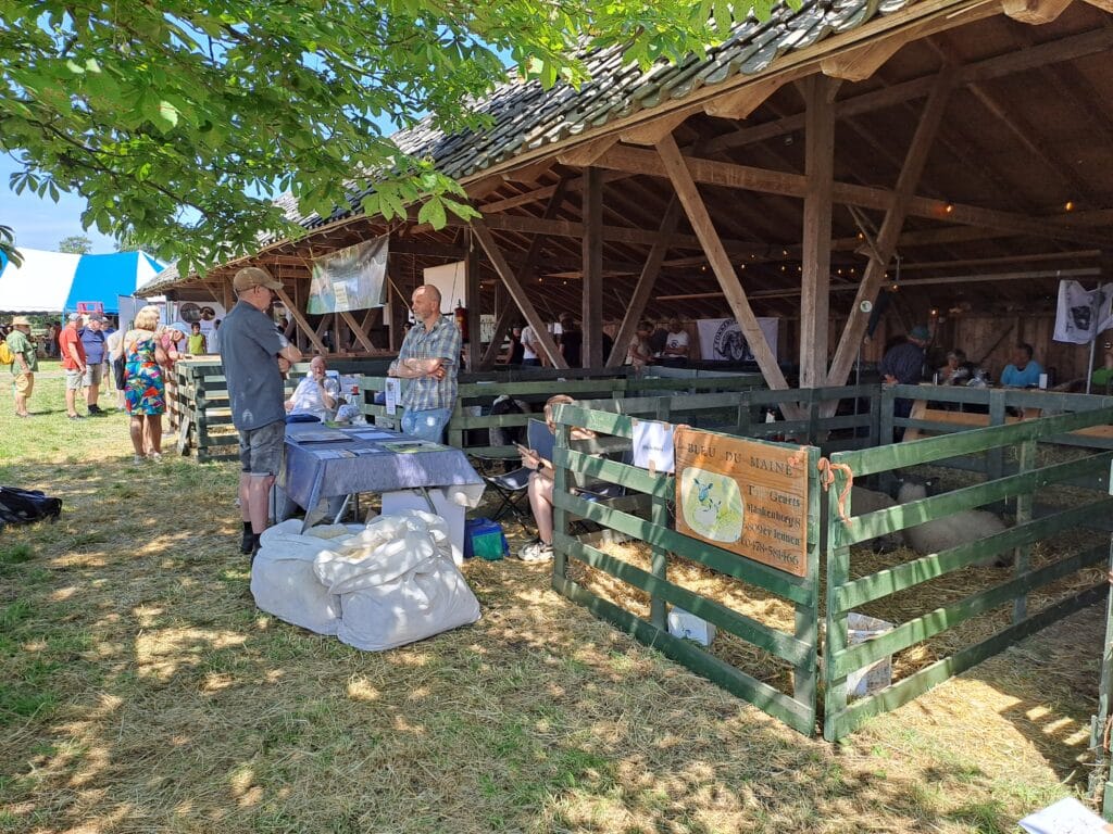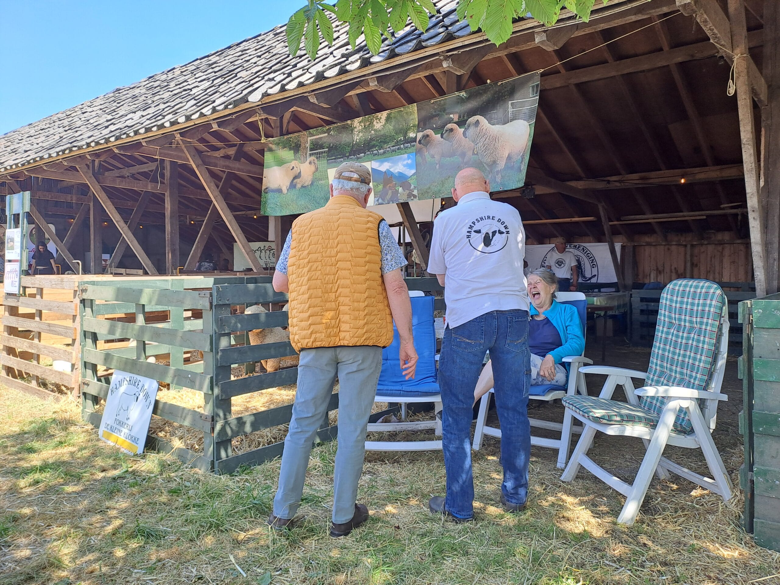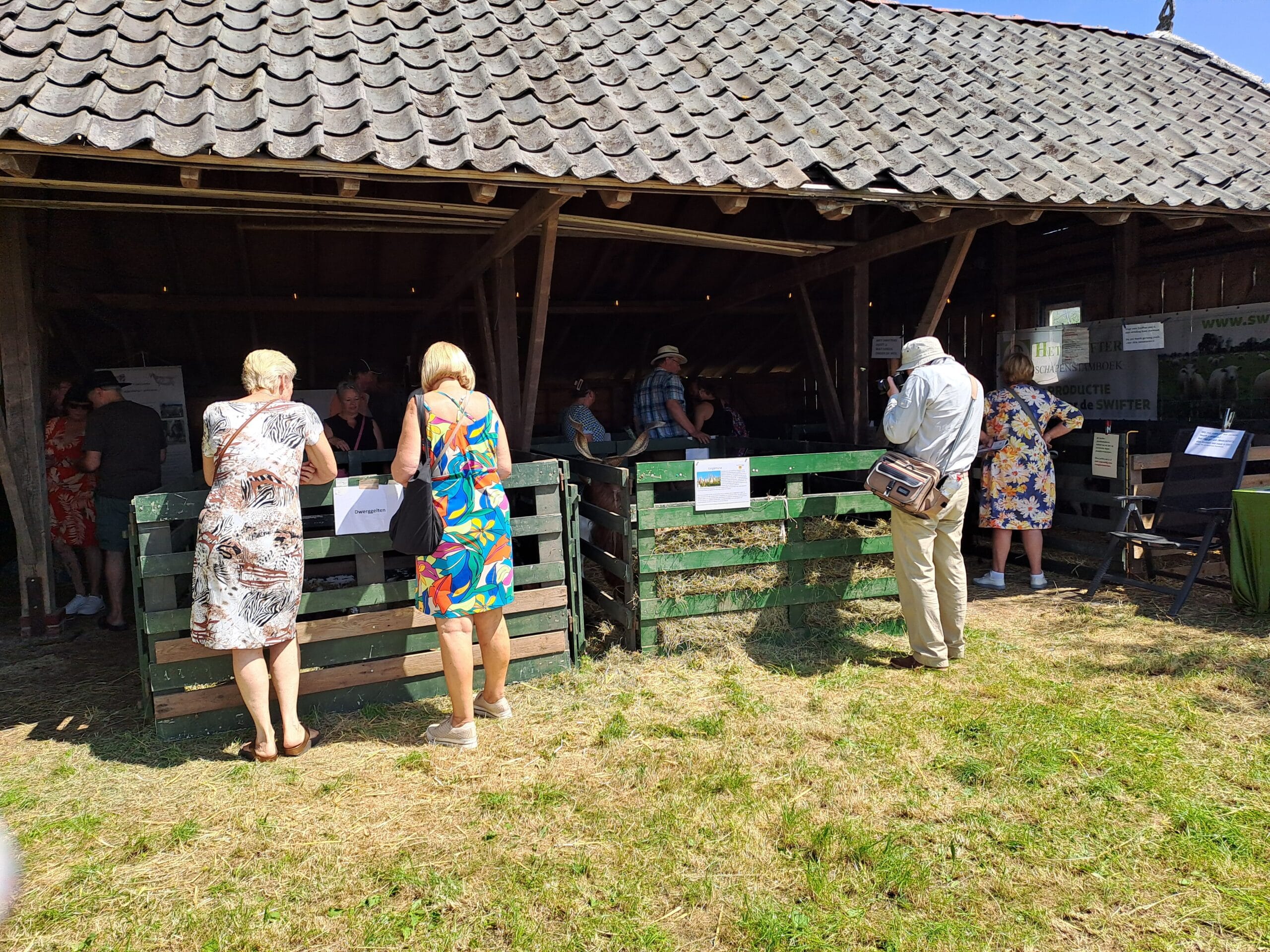 Het was al vroeg druk op de eerste dag van de Farm & Country Fair in Aalten. Bezoekers wilden blijkbaar nog rond voordat de zon het terrein al te heet maakte. Het Schapendorp had gelukkig niets te klagen in hun schaduwrijke schuur met bomen ervoor en een fijne bries er doorheen.