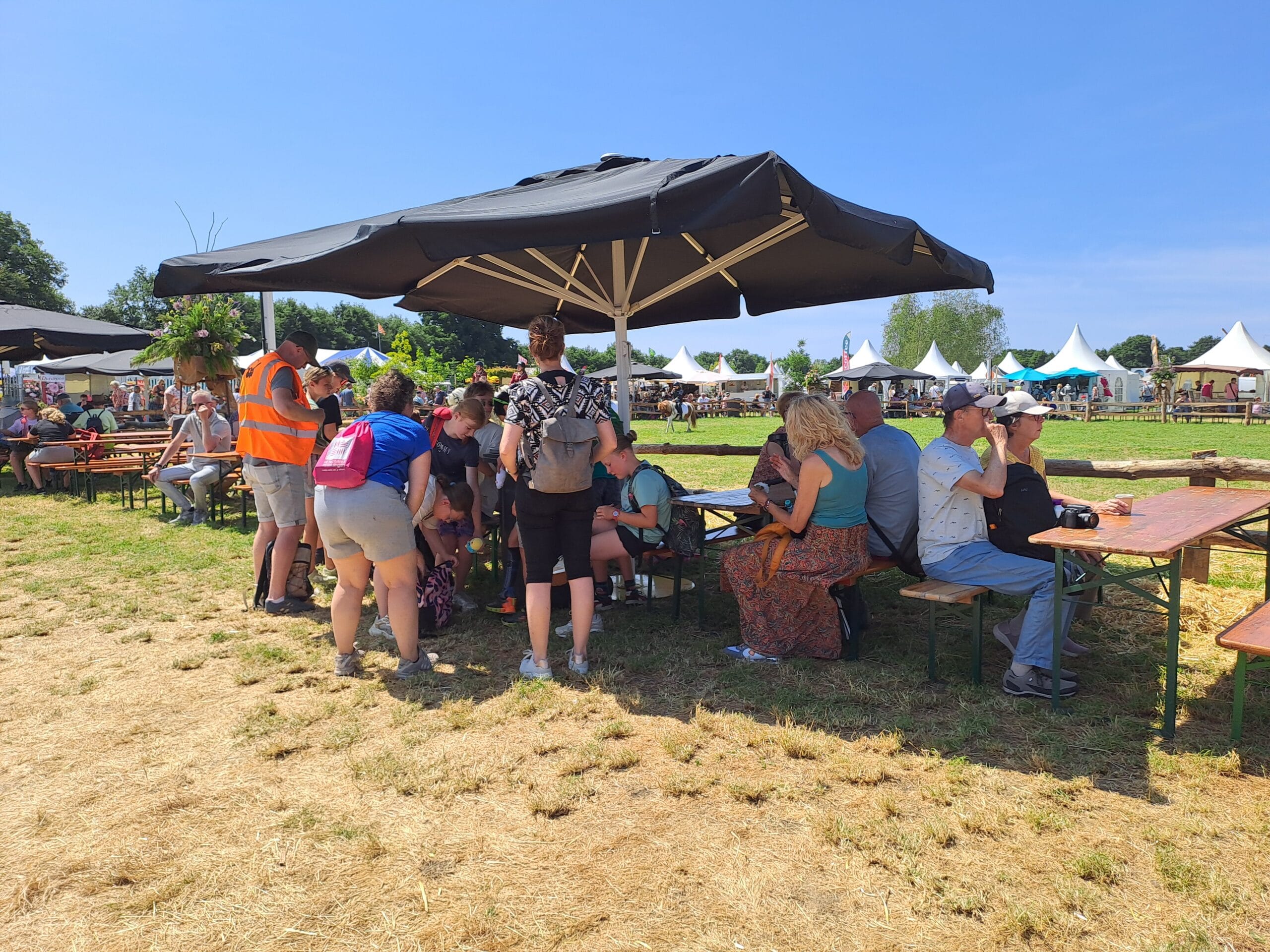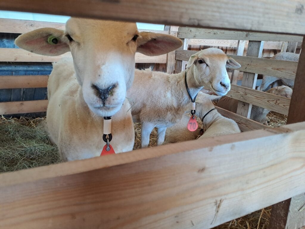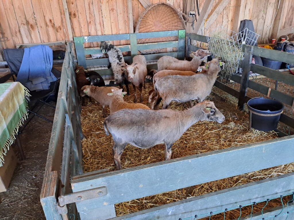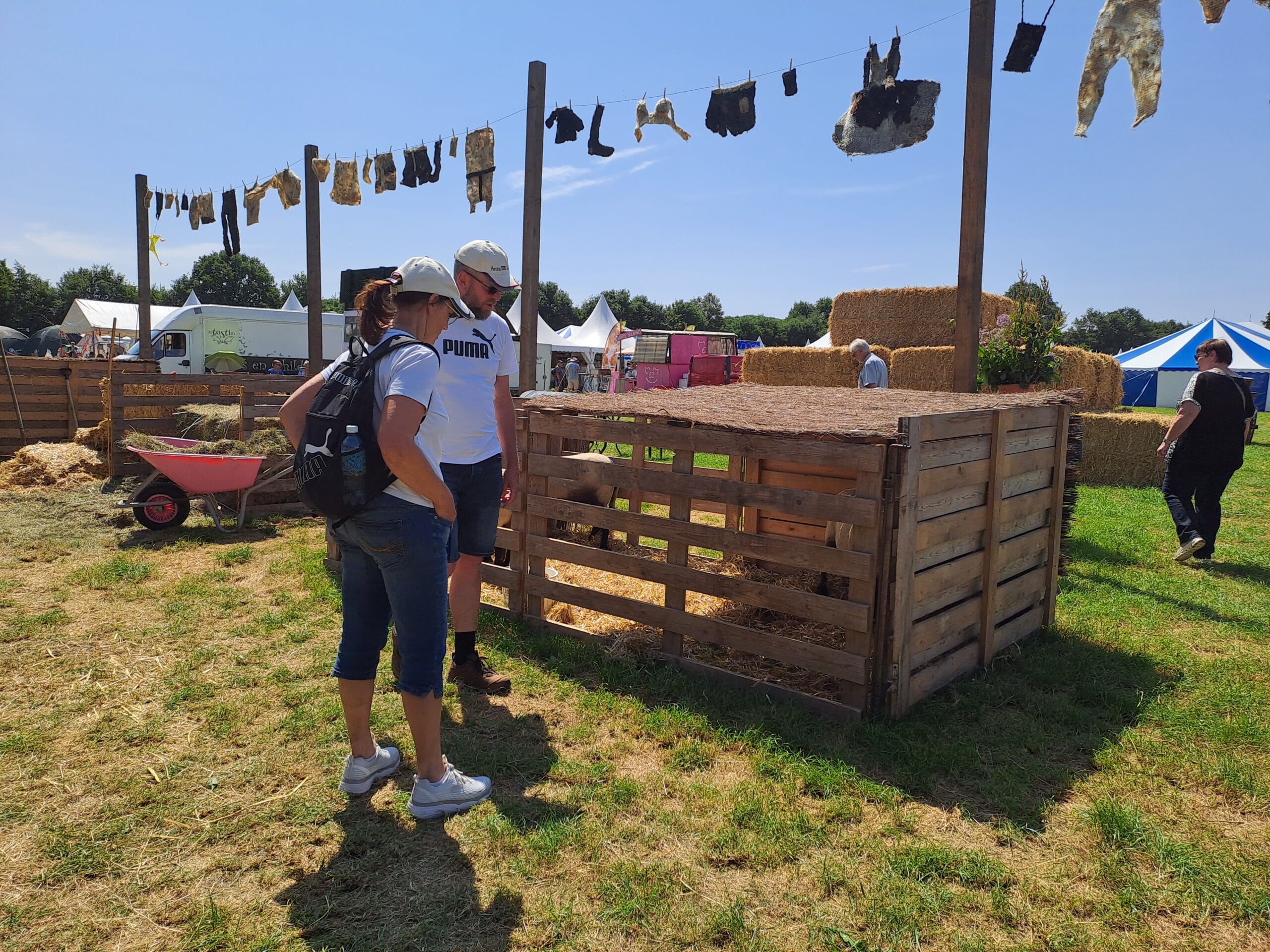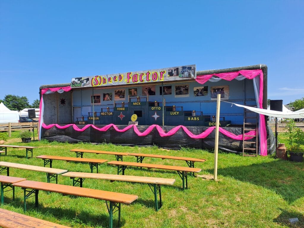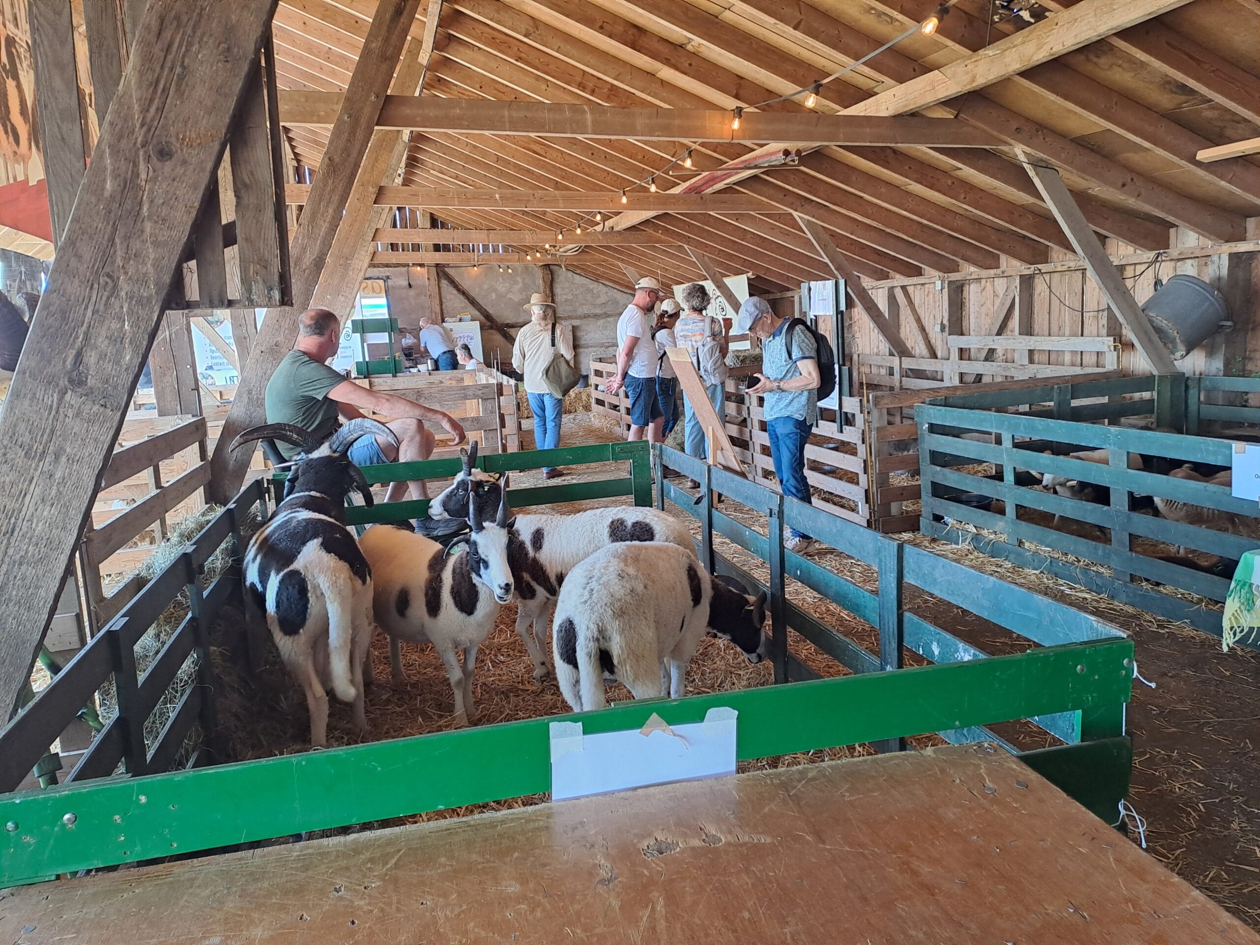 Het was al vroeg druk op de eerste dag van de Farm & Country Fair in Aalten. Bezoekers wilden blijkbaar nog rond voordat de zon het terrein al te heet maakte. Het Schapendorp had gelukkig niets te klagen in hun schaduwrijke schuur met bomen ervoor en een fijne bries er doorheen.