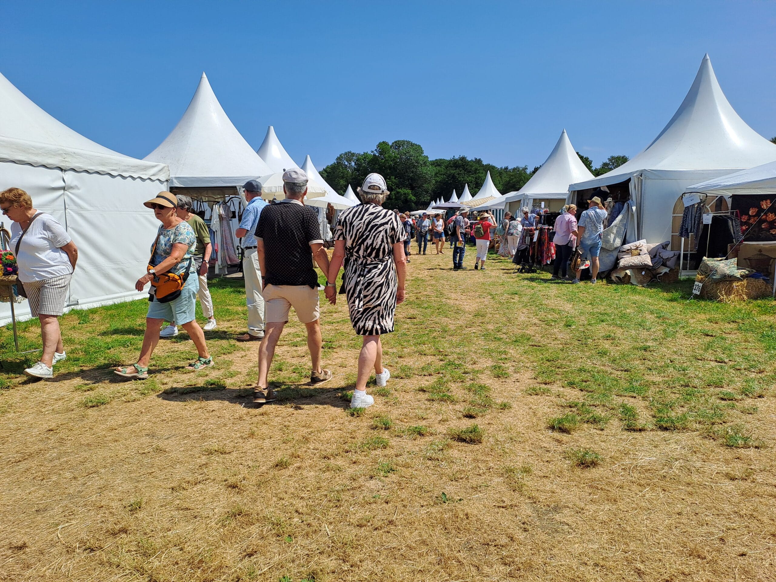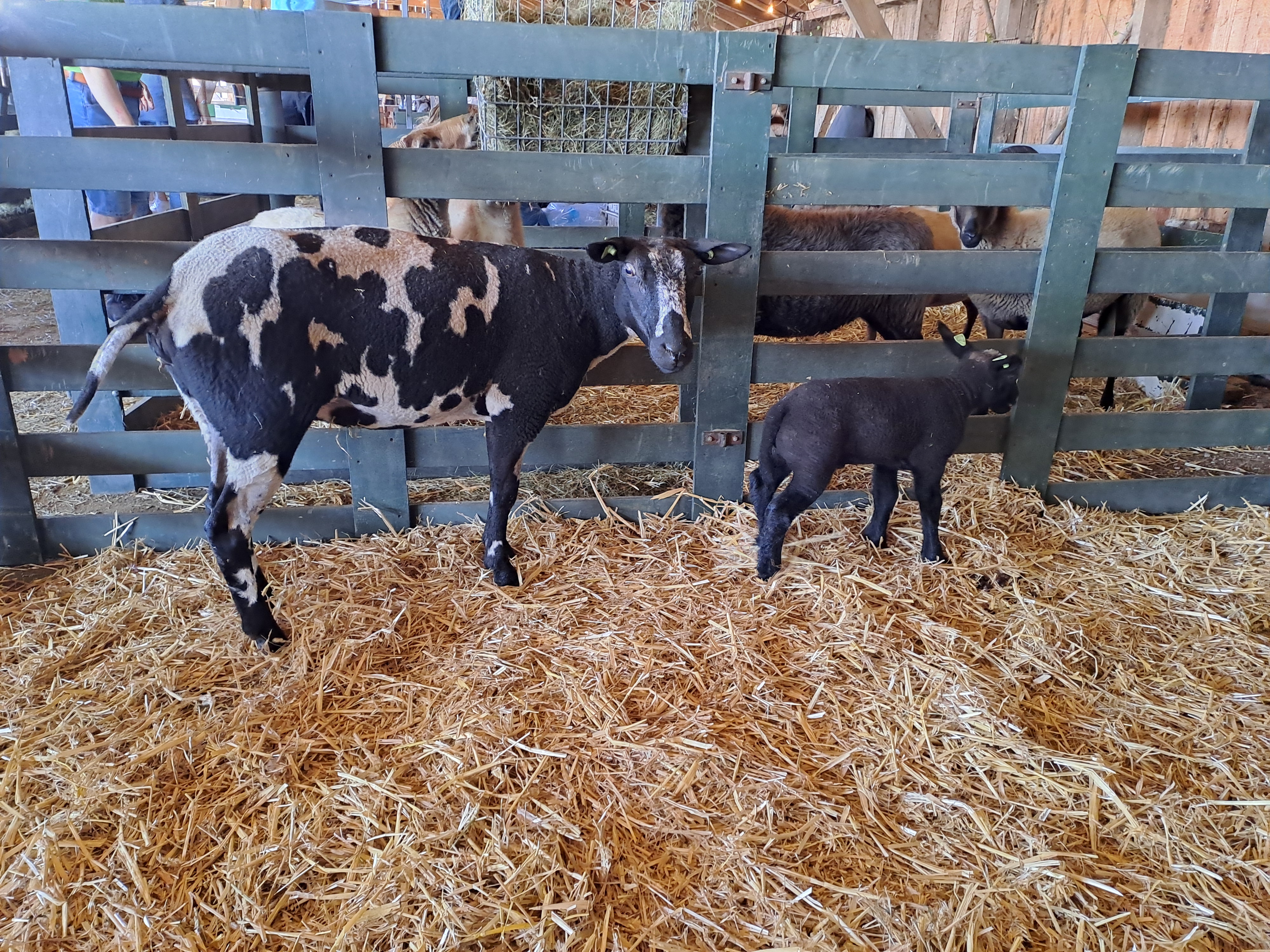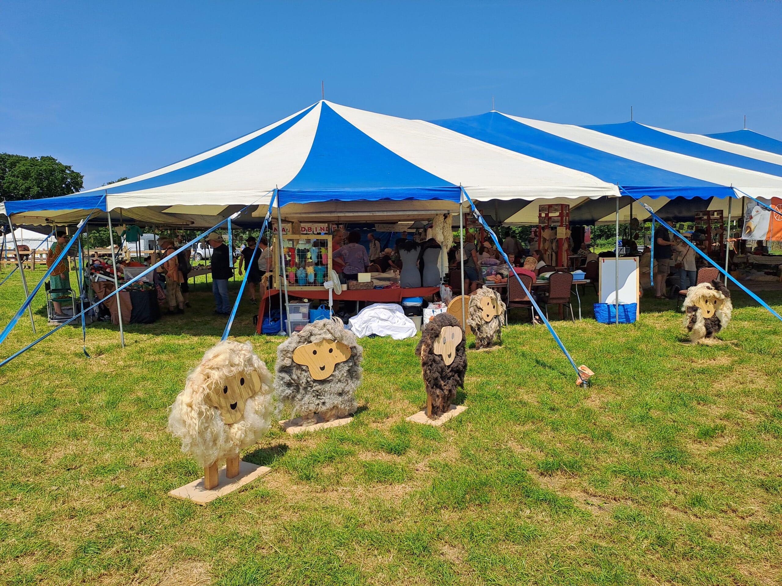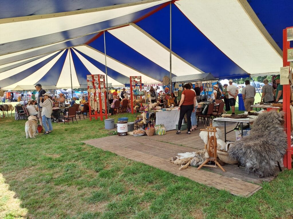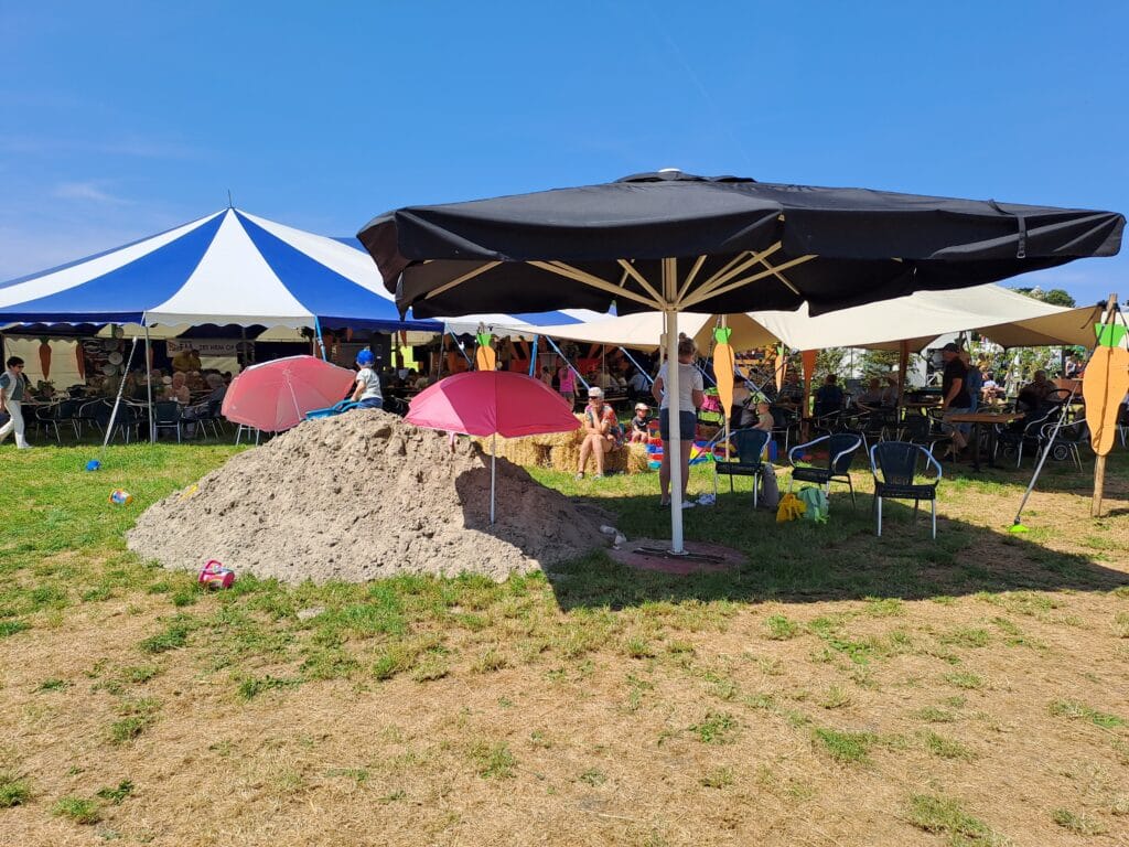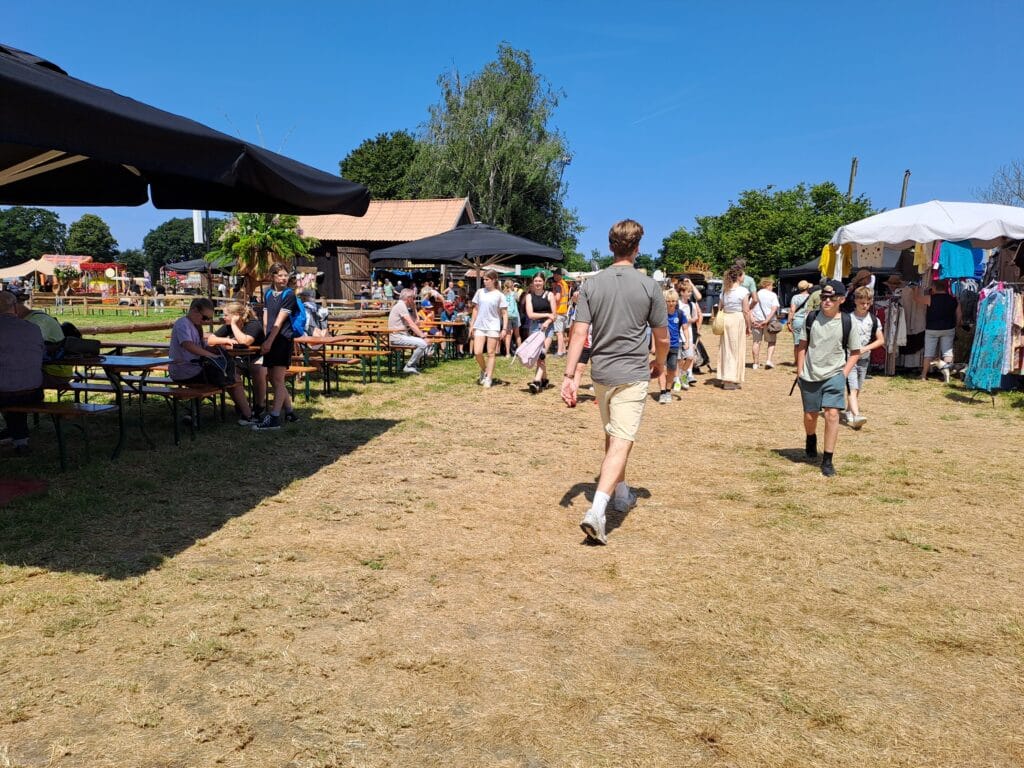 Het was al vroeg druk op de eerste dag van de Farm & Country Fair in Aalten. Bezoekers wilden blijkbaar nog rond voordat de zon het terrein al te heet maakte. Het Schapendorp had gelukkig niets te klagen in hun schaduwrijke schuur met bomen ervoor en een fijne bries er doorheen.