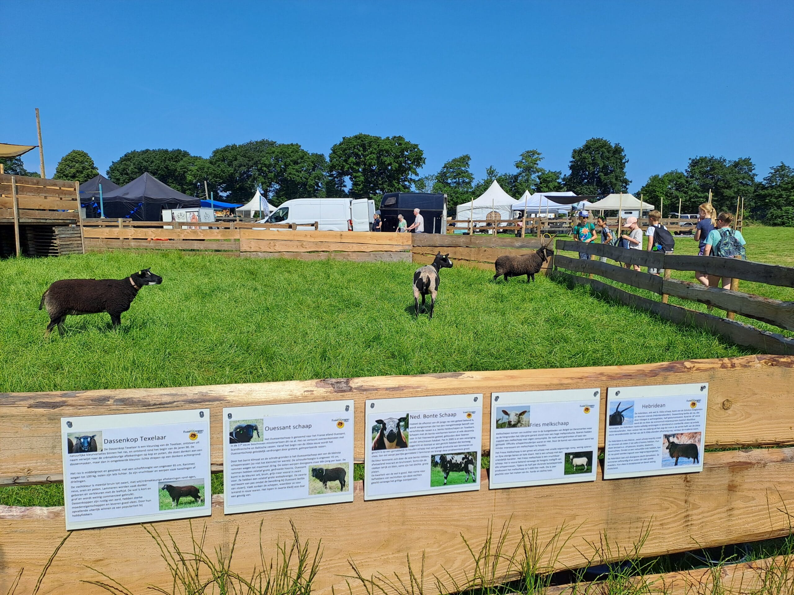 Het was al vroeg druk op de eerste dag van de Farm & Country Fair in Aalten. Bezoekers wilden blijkbaar nog rond voordat de zon het terrein al te heet maakte. Het Schapendorp had gelukkig niets te klagen in hun schaduwrijke schuur met bomen ervoor en een fijne bries er doorheen.