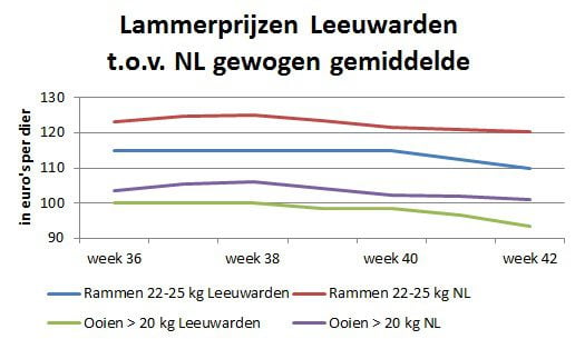 De prijsverschillen tussen de veemarkt in Leeuwarden en de andere veemarkten lopen behoorlijk op. Het grootste prijsverschil is bij de categorie rammen van 22 tot 25 kg. De Friese notering ligt daarbij €10,14 onder de gewogen gemiddelde notering (bovenkant noteringen) van alle drie Nederlandse veemarkten. Bij de rammen tot 22 kg werd er vorige week in Leeuwarden €6,44 minder betaald dan het Nederlandse gemiddelde.