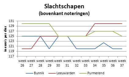 Slachtschapen eerste kwaliteit: €105 tot €130. Tweede kwaliteit: €39 tot €84. Derde kwaliteit: €34 tot €40.