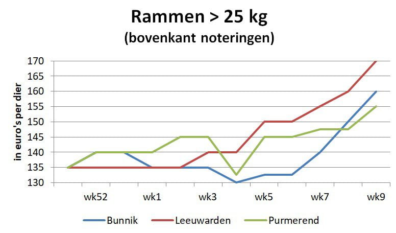Zware rammen brachten vorige week een tientje meer op. Hun marktprijzen zijn in ruim een maand met €30 gestegen. In Leeuwarden wordt nu tot €170 betaald en in Bunnik tot €160.