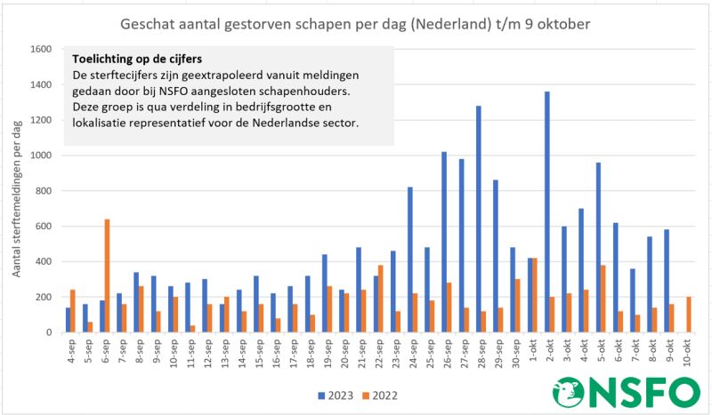 Everts: “Afgelopen week zaten we op een gemiddelde oversterfte van 429 schapen per dag; een week daarvoor op 634 per dag en week daarvoor (de eerste piekweek) ook op 429 schapen per dag. Het stijgt gelukkig niet verder door tot zo ver maar we zitten inmiddels al wel boven de 10.000 extra gestorven dieren sinds de uitbraak van 4 september.”