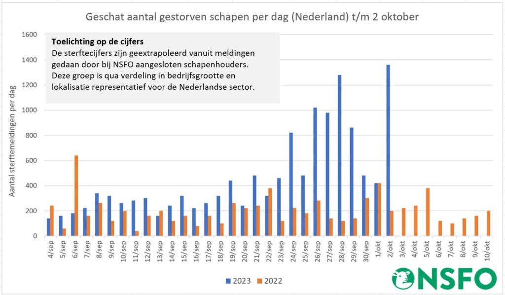 In de onderstaande grafiek zijn het geschat(!) aantal gestorven schapen per dag af te lezen. De sterfte van de dieren van NSFO-leden is doorgetrokken naar heel Nederland. De sterftecijfers van dit jaar en vorig jaar in diezelfde periode zijn vervolgens naast elkaar gezet.