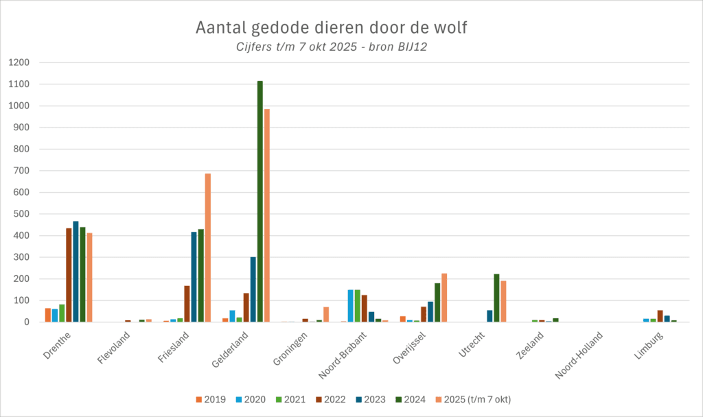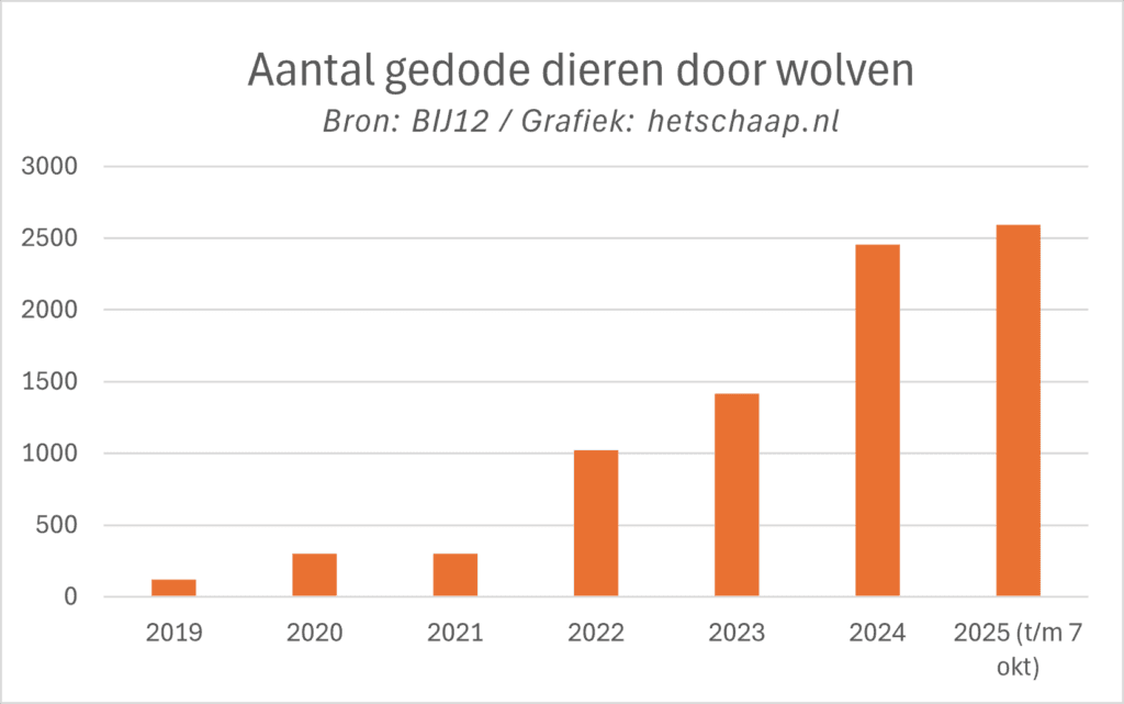 Wolven in Nederland doodden dit jaar al 2.592 schapen en ander vee, dat zijn de BIJ12-cijfers tot en met 7 oktober 2025. Dat betekent dat er gemiddeld ruim 63 dieren per week zijn gedood.
