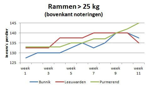 De gewogen gemiddelde marktprijs van rammen boven 25 kg daalde vorige week met €2,85 naar €137,32. Dit komt omdat ze minder opbrachten in Bunnik en Leeuwarden. Purmerend daarentegen meldde een stijgende notering.